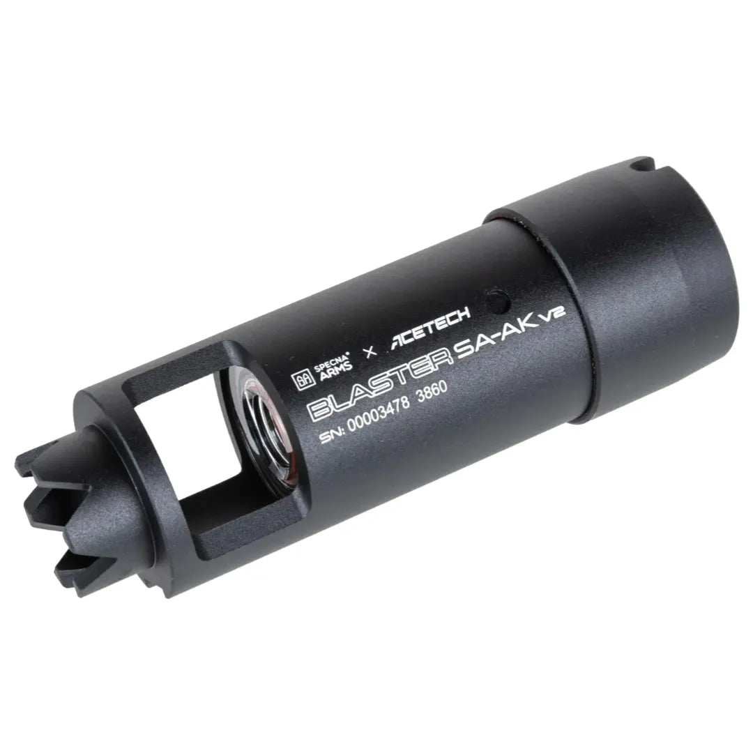 Tracer Blaster SA-AK v2 är ett samarbete mellan Specna Arms och AceTech, kända för deras högkvalitativa tillbehör till airsoft-vapen. Denna kompakta, lätta ljuddämpare ger airsoft-spelare imponerande funktionalitet med tre driftslägen: tracer, flamimitation, och tracer + flamimitation. Den imiterar flamdämpare du hittar på AK modeller, men passar perfekt för att ge andra typer av replikor ett snyggt utseende.