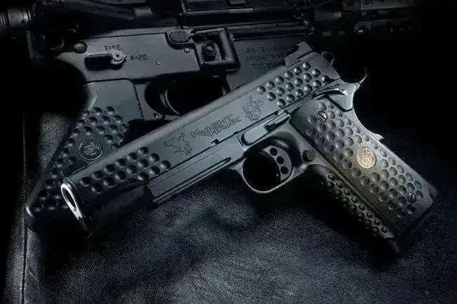 Snygg softgun-replika från 1911 med blowback. Det här är pistolen för dig som älskar den klassiska Colt-pistolen men vill ha en mer taktisk känsla på den - Mattsvart färg med "golfbolls"-mönster i glid och grepp gör att den sticker ut och ger bra grepp både runt glid och pistolgrepp.