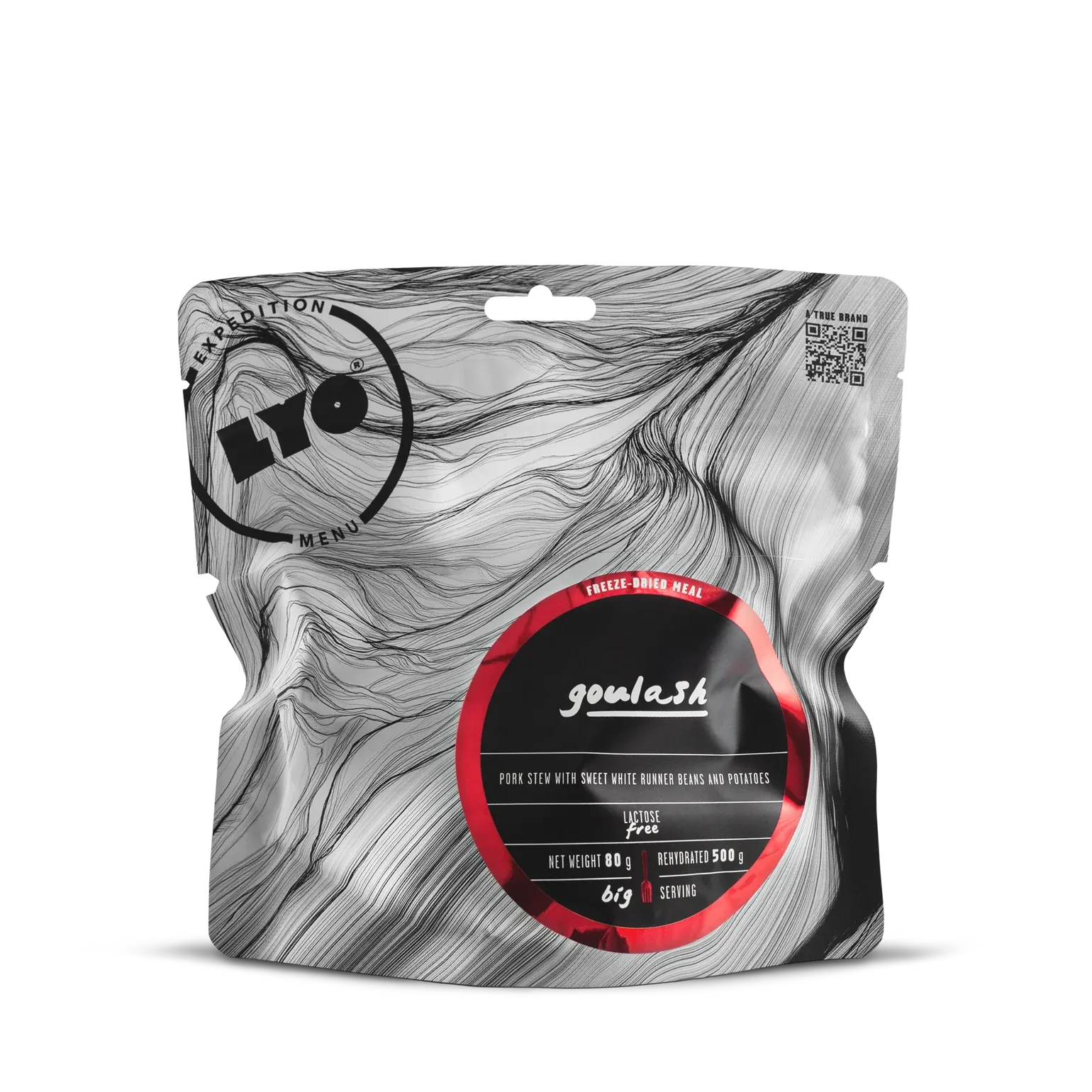 LYOFOOD Goulash är en värmande och smakrik fläskgryta inspirerad av den ungerska klassikern. Rätten innehåller möra bitar av fläskkött, vita bönor och potatis i en kraftig tomatbaserad sås tillsammans med morot, paprika och persiljerot. Med 100 % naturliga ingredienser och lång hållbarhet är detta en perfekt middag för fjällvandring, jakt eller expedition – oavsett väder och säsong.
