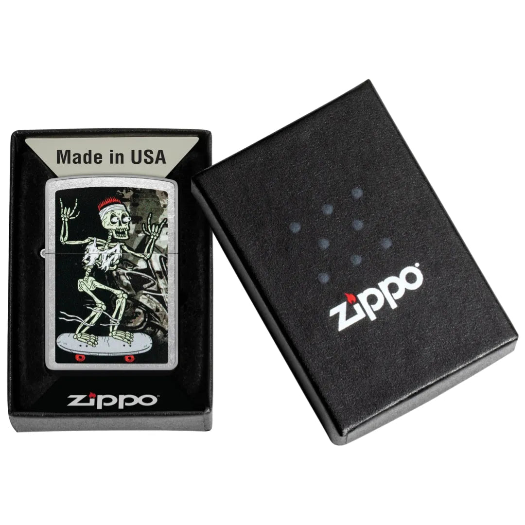 En ikonisk Zippo-tändare med en cool "Skridskoåkande Skelett"-design tryckt på en klassisk Street Chrome-yta. Perfekt för skate-entusiaster och samlare. Zippo-tändaren levereras i en presentask och fungerar optimalt med Zippo bensin.