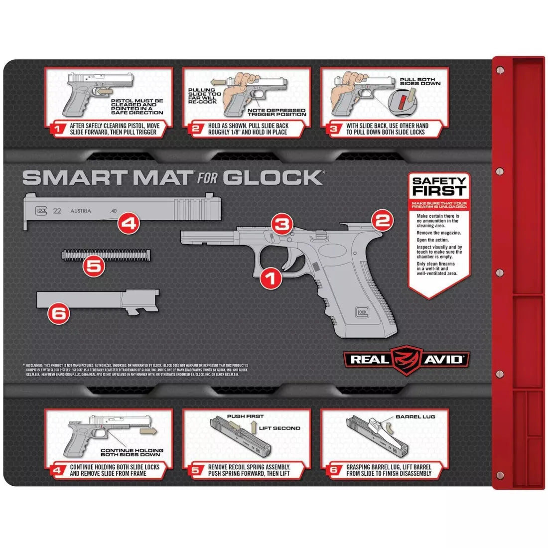 Real Avid Smart Mat för Glock är en specialdesignad vapenmatta skapad för demontering och rengöring av Glock-pistoler. Med en yta på 48x41cm ger denna matta gott om plats att arbeta med pistolen medan en integrerad steg-för-steg demonteringsguide erbjuder en enkel och säker process för användaren.