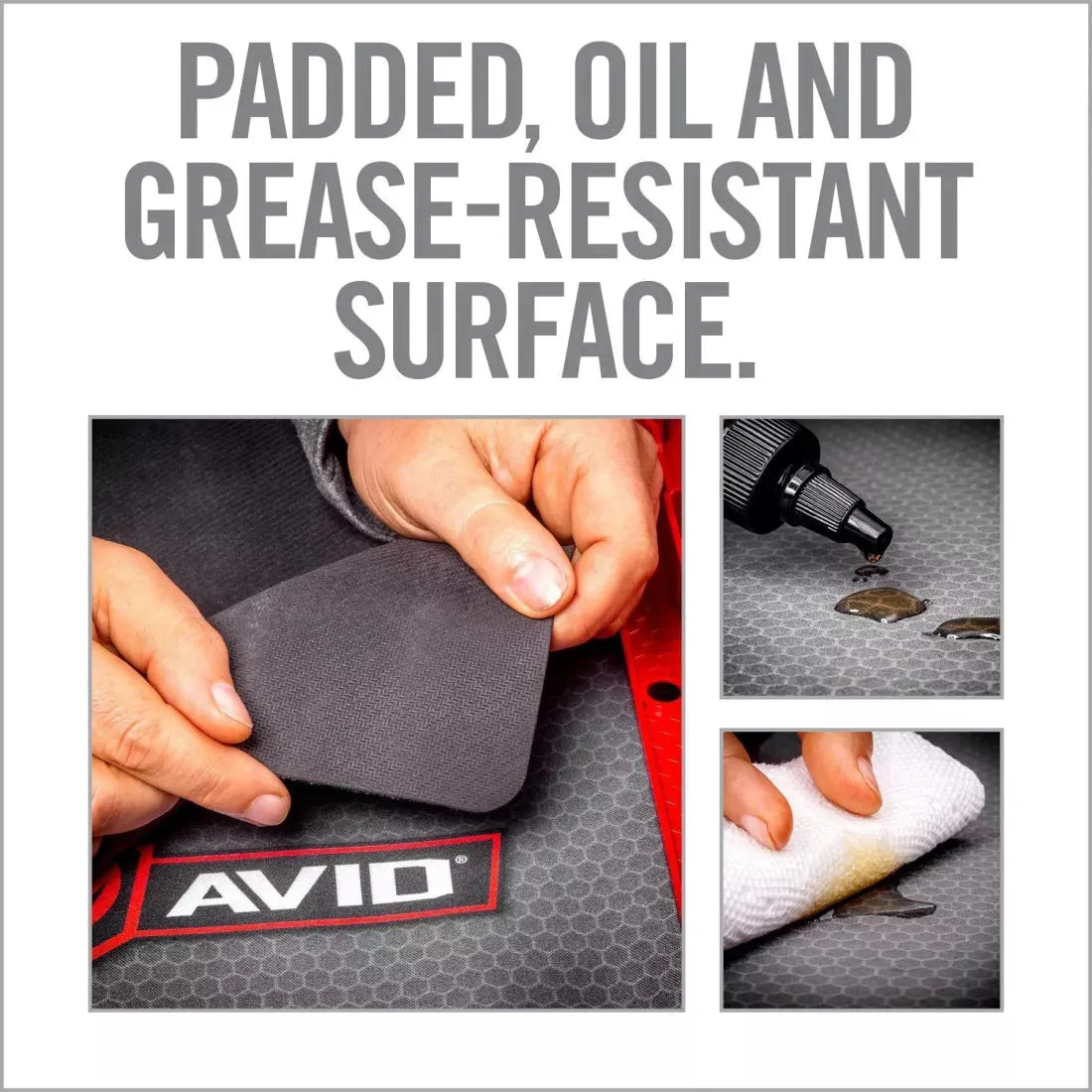 Mattan har en inbyggd magnetisk delskål och en fast monterad förvaringssektion som håller smådelar som stift, skruvar och fjädrar säkert på plats. Den olje- och lösningsmedelsresistenta ytan skyddar arbetsområdet, medan den halkfria baksidan säkerställer att mattan stannar på plats under användning.