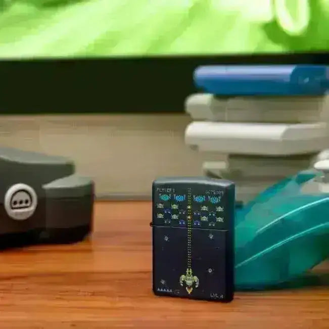 Retro gaming Zippo för gamers och alla som älskar retro saker - Matt marin bakgrund med pixel game print