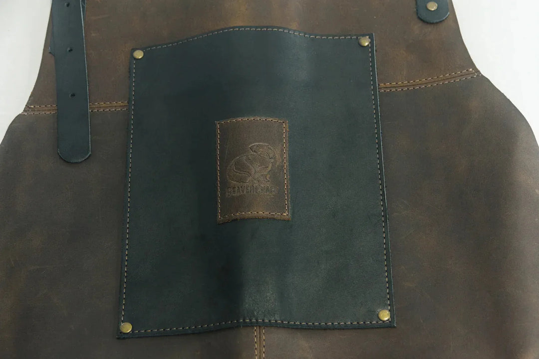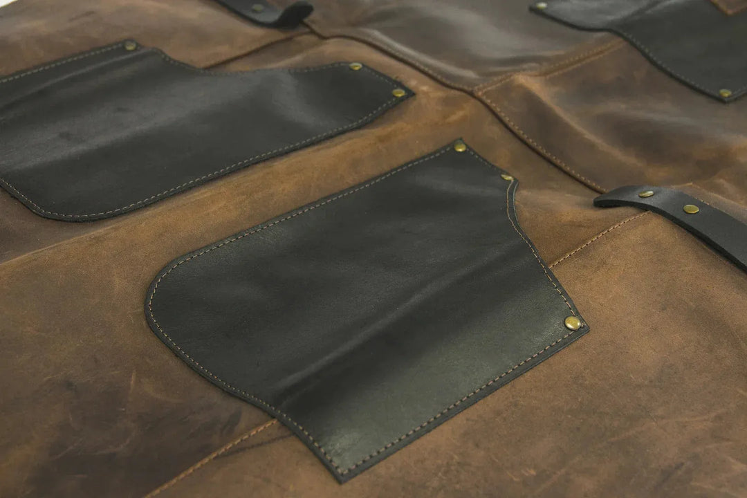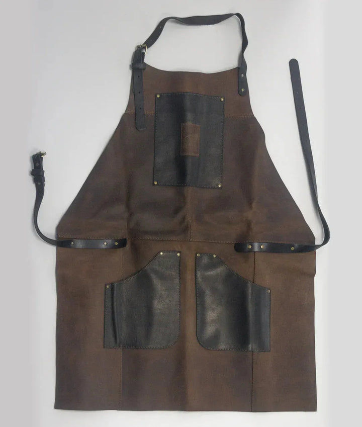 Slitstarkt och stilrent arbetsförkläde i brunt och svart läder – för kreativa och praktiska yrken