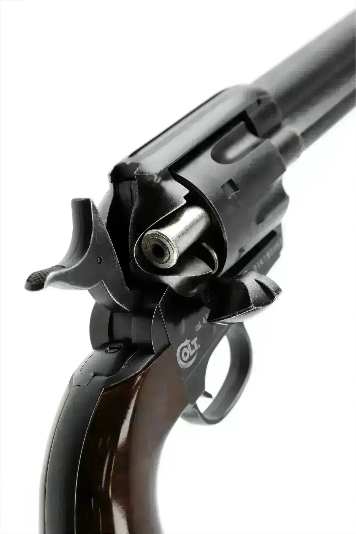4,5 mm BB-versionen av denna klassiker är verkligen en fröjd för ögat och revolvern har samma utseende, känsla och funktionalitet som den ursprungliga .45 Colt Peacemaker. Liksom den riktiga revolvern sträcker sig inte heller pipan på denna. Varje patron laddas individuellt i laddningshålet på cylinderns högra sida. Dra hammaren halvvägs bakåt, rotera sedan pipan och sätt i en ny laddad patron. För att ta bort en tom patron, gör exakt samma sak i motsatt riktning och tryck på frigöringsstången. För att ladda patronerna med BB kulor sätt in en BB-kula i botten av varje patron.