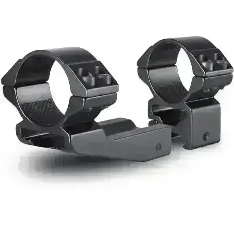 Aluminiumfästen med anodiserad svart yta. Monteringsringarna har en mjuk och fin beläggning på insidan som håller optiken stadigt på plats och förhindrar att optiken repas. Monteringsringarna är höga för att ge plats åt bredare optik och passar bra med lite större kikare.