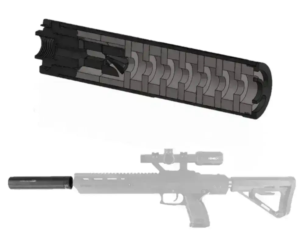 Ljuddämpare för airsoft med dämpande effekt. Dämparen är gjord av samma typ av aluminium som används på flygplan, skummet inuti dämparen är samma typ som används i ljudstudior för att absorbera så mycket ljud som möjligt. Kolla också omslag från Novritsch.