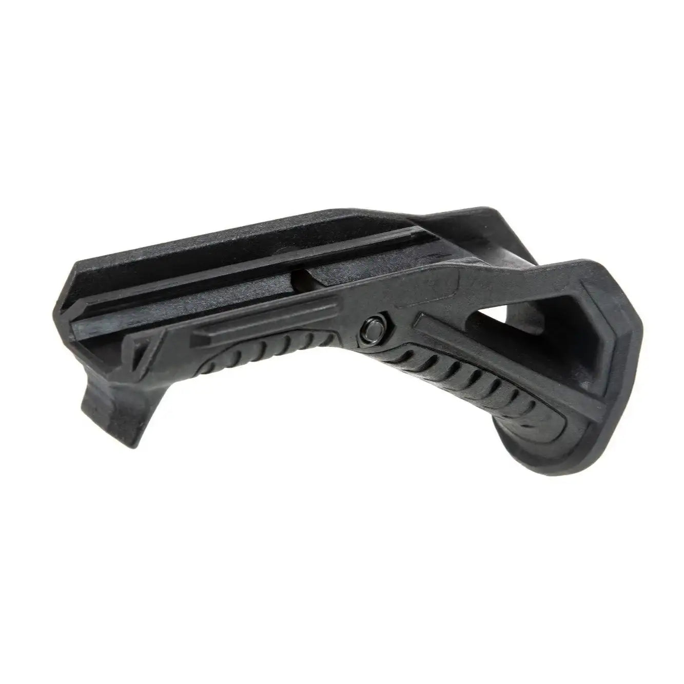 Detta främre grepp är tillverkat av mycket slitstark polymer med metallskruvar. Du monterar greppet enkelt på alla 21mm skenor och är en utmärkt ersättning för vanliga vertikala frontgrepp. Tack vare greppets design får handen ett optimalt grepp runt geväret och tummen vilar automatiskt på sidan av greppet. Det gör i sin tur att du får ett väldigt stabilt vapen att skjuta med, oavsett om du siktar länge eller behöver skjuta snabbt mot målet.