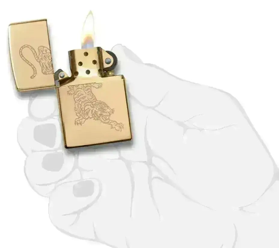 Snygg blank mässingsyta med ingraverat motiv av en tiger. Denna originala zippo ser lika bra ut som prydnad på hyllan som den är att ha med sig på utflykt! Zippo är vindtät och passar utmärkt för friluftsliv.