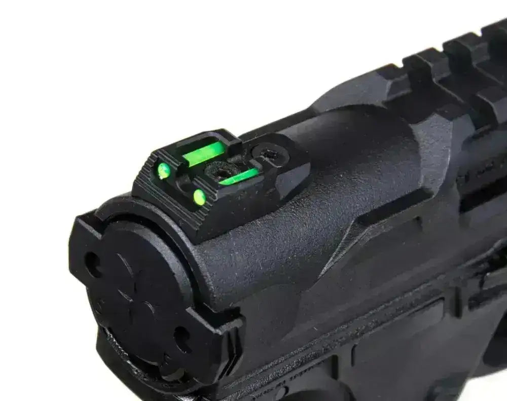 Pistolen har justerbar hopup som ger bra räckvidd och optimal kulbana. Blowback-systemet fungerar som på Ruger Mk1 modeller där slutstycket går tillbaka för varje skott.Du kommer enkelt att kunna få en bra siktbild tack vare bidraget från de fiber-optiska siktena som är i kontrastfärger.