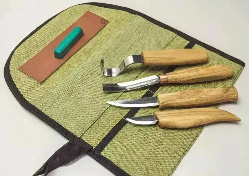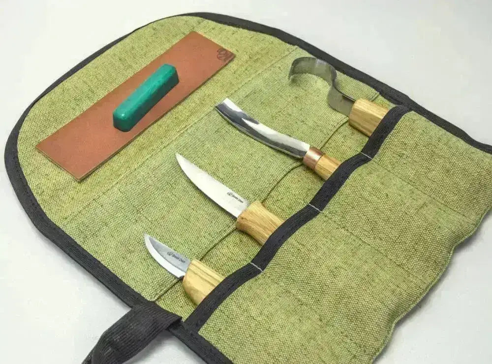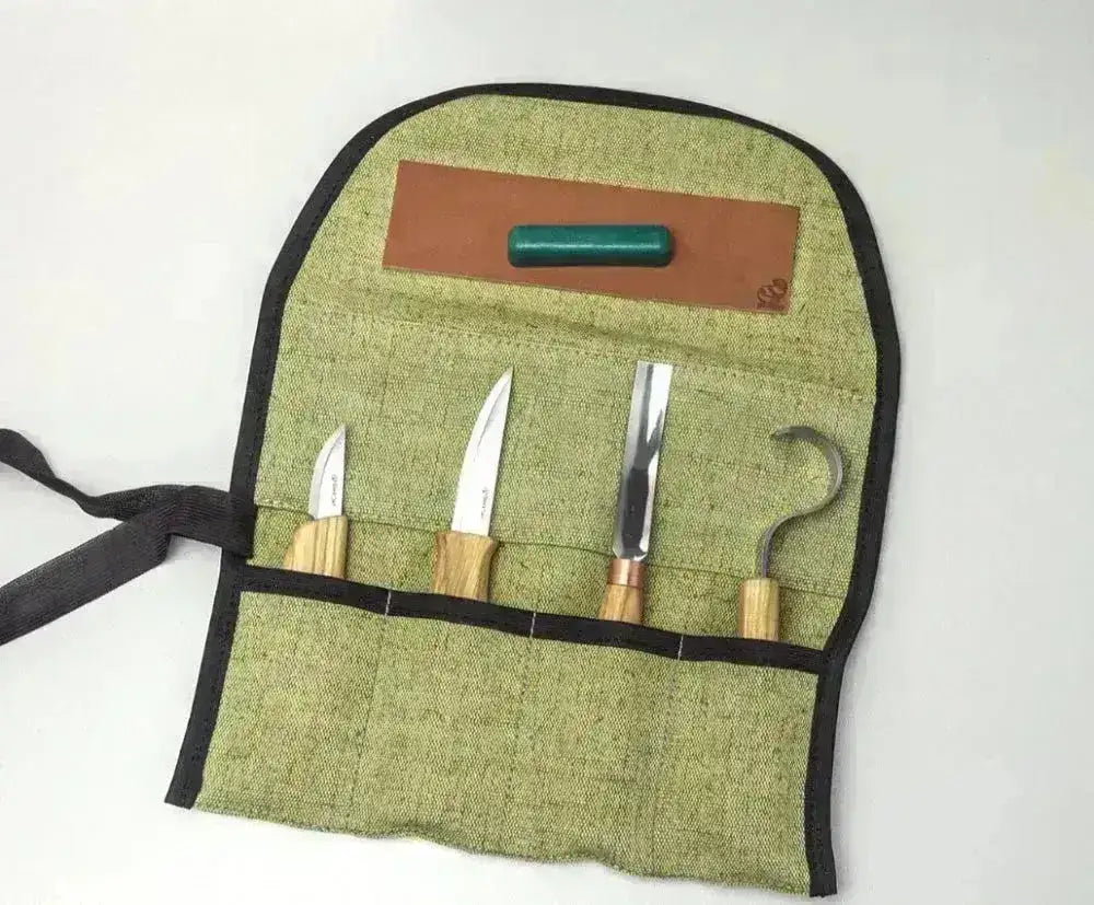 Setet levereras med tre precisionsverktyg: en urholkningskniv, en universell sniderikniv och en detaljkniv – alla tillverkade med vassa blad i kolstål och bekväma trähandtag. Allt förvaras säkert i ett robust rullfodral i äkta läder, redo att användas hemma, i verkstaden eller på resan.