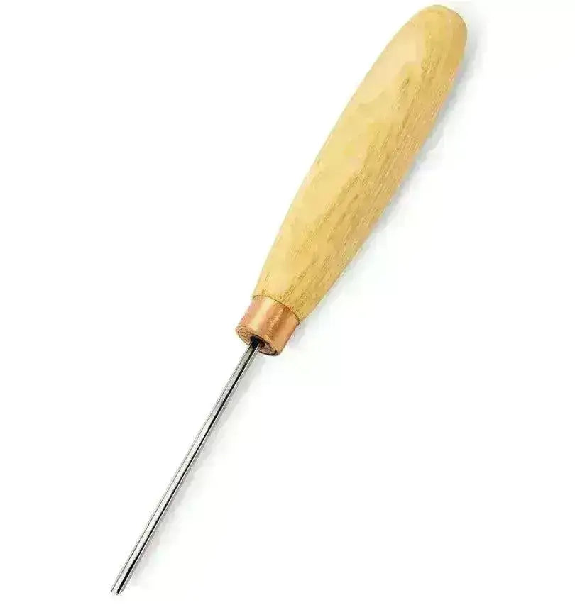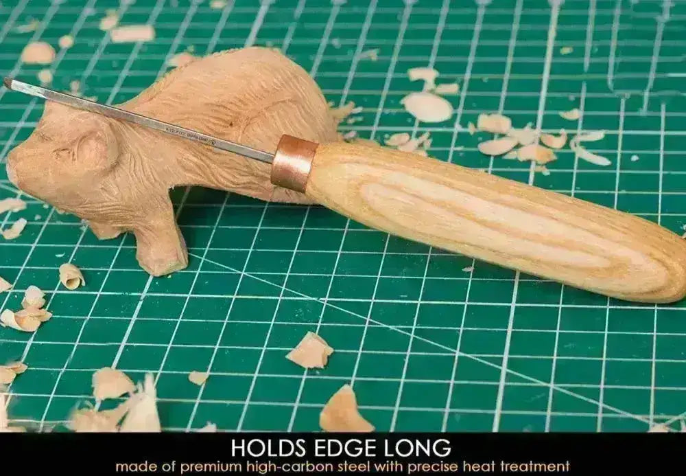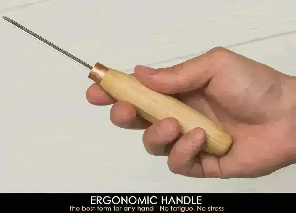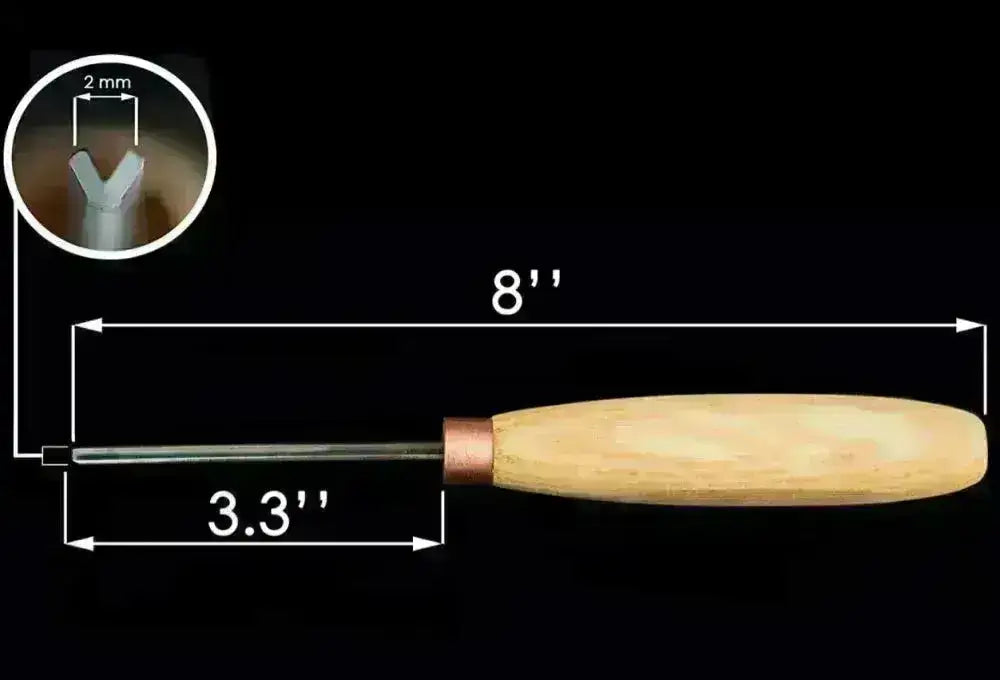 Handgjord mejsel från Ukraina. K12/02 är ett skarpt träsnideriverktyg med 2 mm bredd och V-profil med 60 graders vinkel, perfekt för träsnideriprojekt och ett fantastiskt träbearbetningsverktyg att ha i din snickeri!