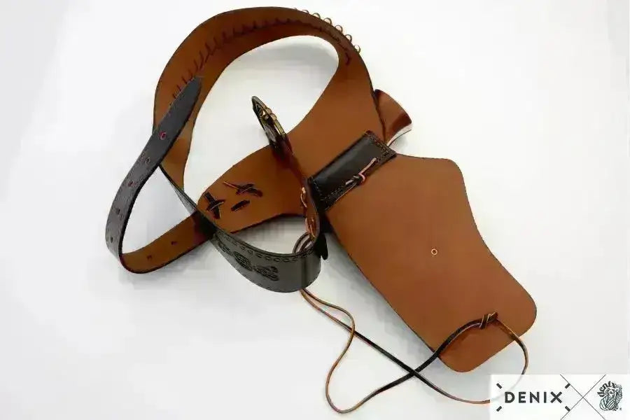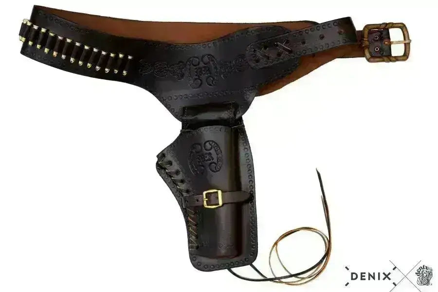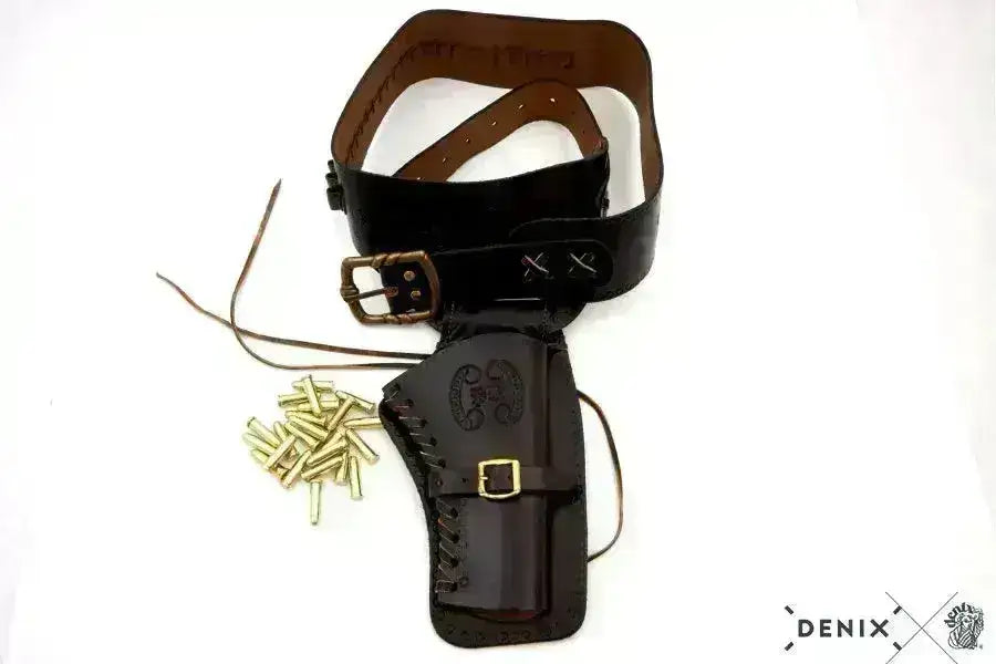 Denix Westernbälte med hölster för högerhänta. Tillverkad av läder och är ett cowboybälte av högsta kvalitet med ett hölster på höger sida.