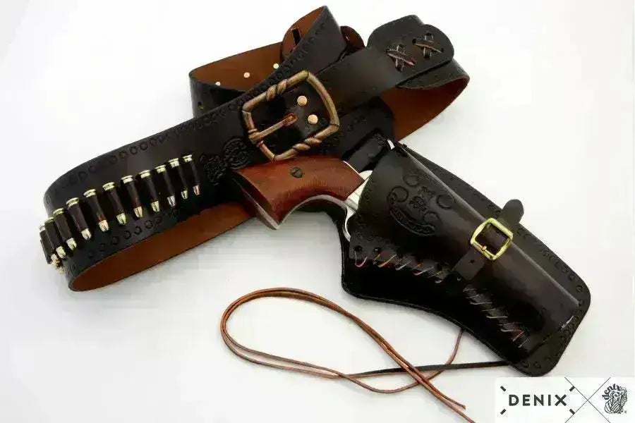Ett måste om du har en SAA revolver eller liknande - Detta Denix-bälte är 112 cm långt med flera knappar för att justera längden. Passar de flesta och rymmer 1 revolver och totalt 24 patroner (revolver och patroner ingår ej!).