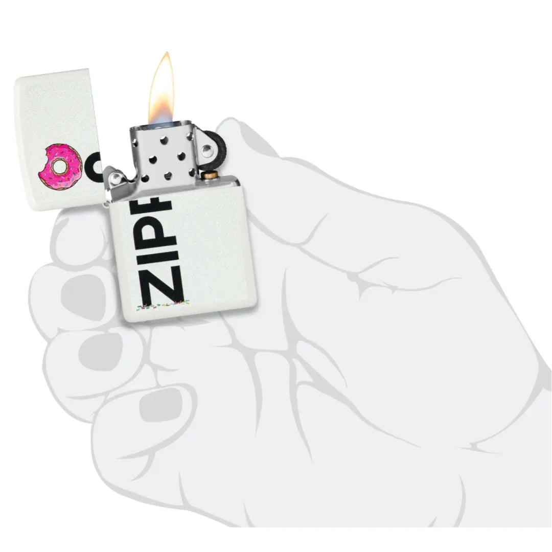 Gör tändaren till ett uttalande med denna vita matta Zippo-tändare med en rolig och iögonfallande design. En snygg frostad munkdesign är integrerad i Zippo-logotypen med färgrik bildteknik. Perfekt som present eller för eget bruk. Levereras i en presentask.