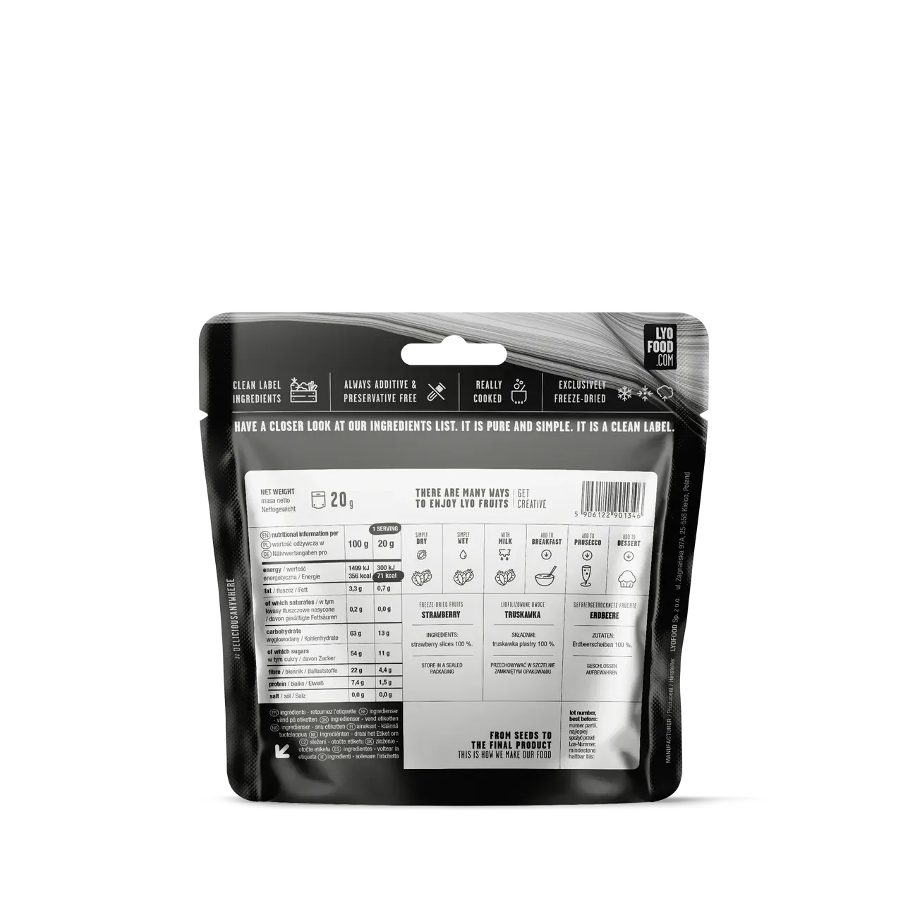 Dessa frysetorkade jordgubbar från LYOFOOD är gjorda av 100 % färska jordgubbar, utan tillsatt socker, konserveringsmedel eller tillsatser. Njut av dem som snacks, blanda i frukost, smoothie, dessert – eller gör utflykten mer festlig. Perfekt för friluftsliv, bakning och som ett naturligt snack.