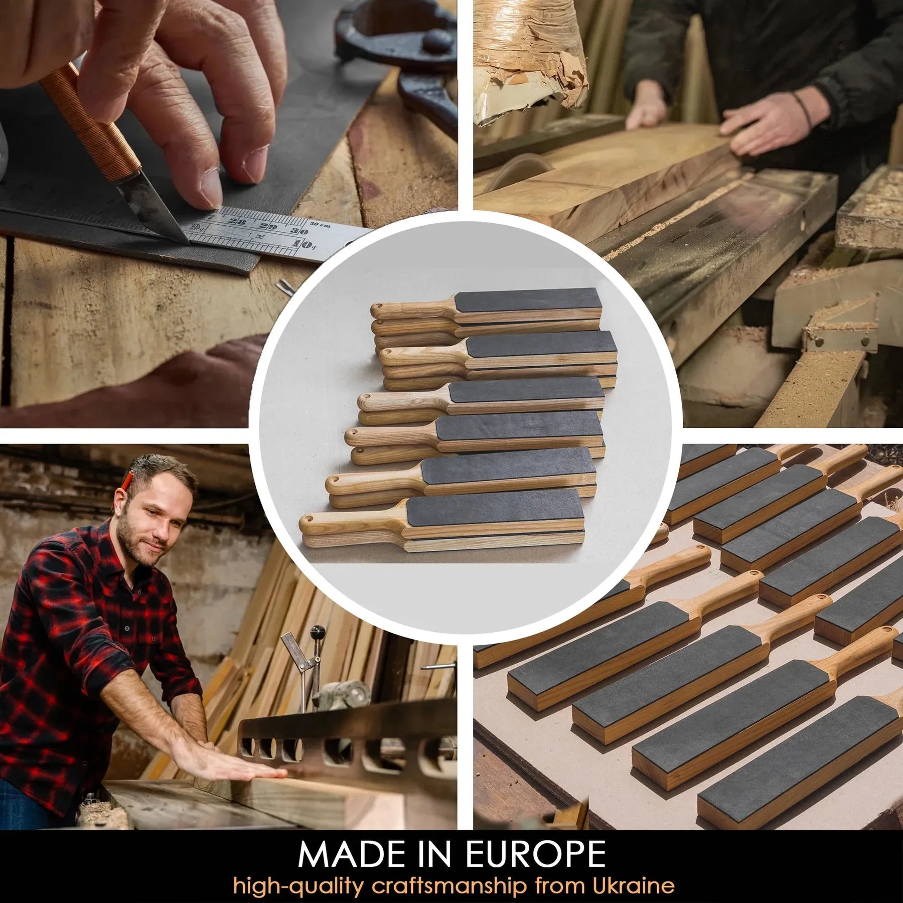 Med en bas av solid ask och yta av äkta kohud, är stroppen byggd för hållbarhet och komfort.Det ergonomiska handtaget gör slipningen enkel och effektiv, utan att kompromissa med precisionen.