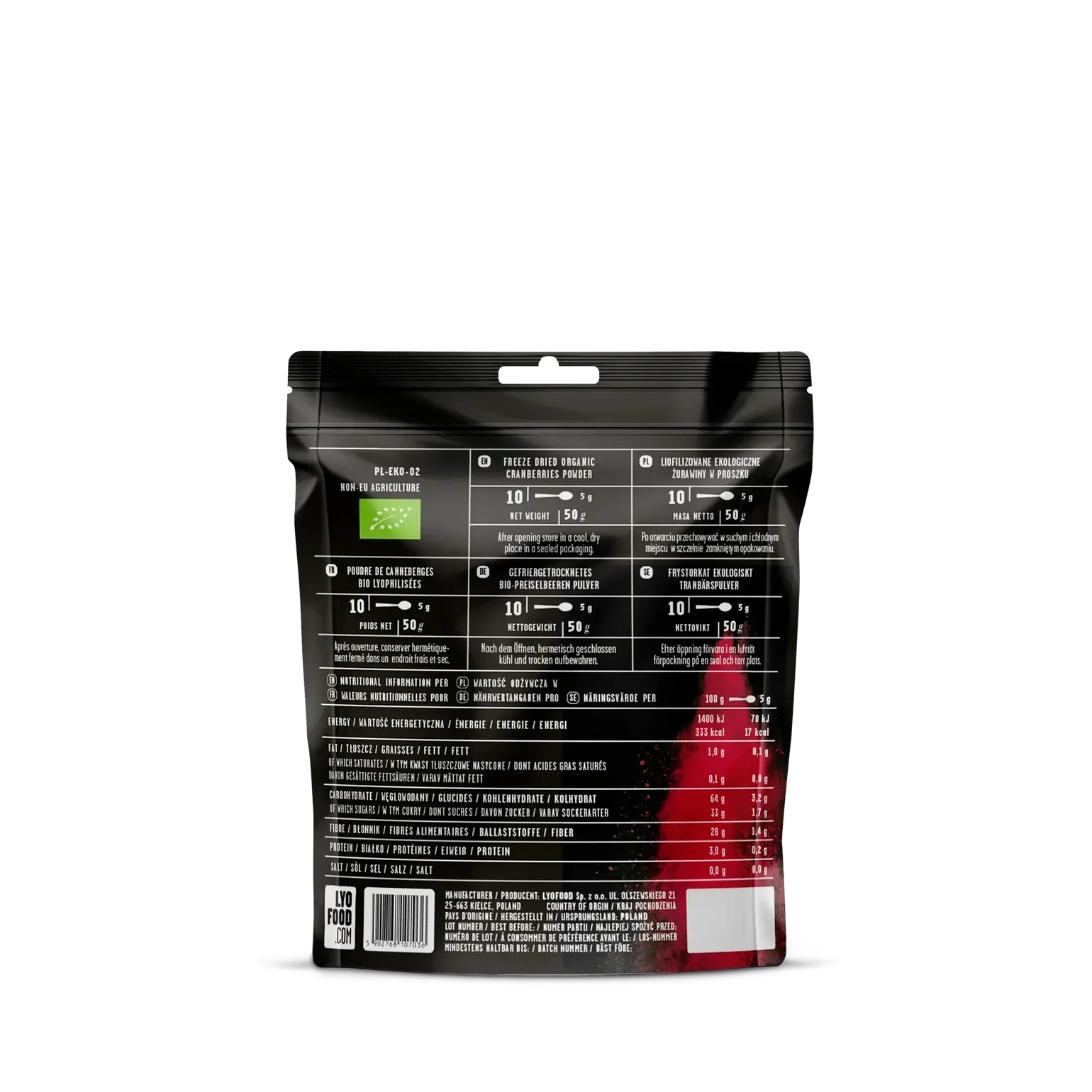 Naturlig styrka – rik på antioxidanter och vitaminerLYOFOOD Cranberry Powder ger dig tranbär i dess renaste form, varsamt torkade och malda till pulver. Perfekt för att boosta smoothies, gröt, yoghurt eller energibars med en naturlig källa till antioxidanter och vitamin C. Tillverkat av ekologiska tranbär – 100 % naturligt, inga tillsatser.