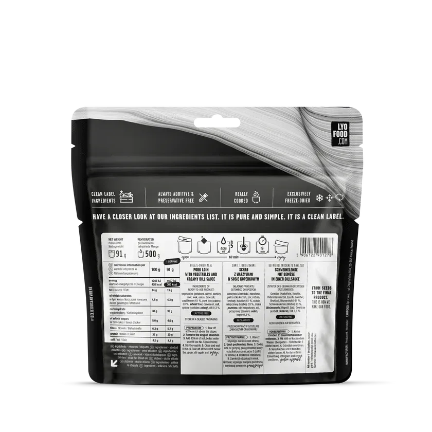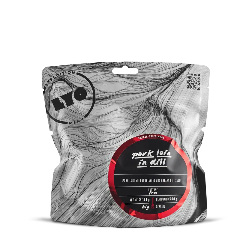 LYOFOOD Pork Loin in Dill Sauce är en smakrik middag med fläskkött och potatis i en mild, kryddig dillsås. Rätten innehåller 100 % naturliga ingredienser – inga konstgjorda tillsatser – och är fri från laktos. Den ger en fyllig och mättande upplevelse, perfekt för vandring, expedition eller fältanvändning där du behöver god mat med låg vikt och hög hållbarhet.