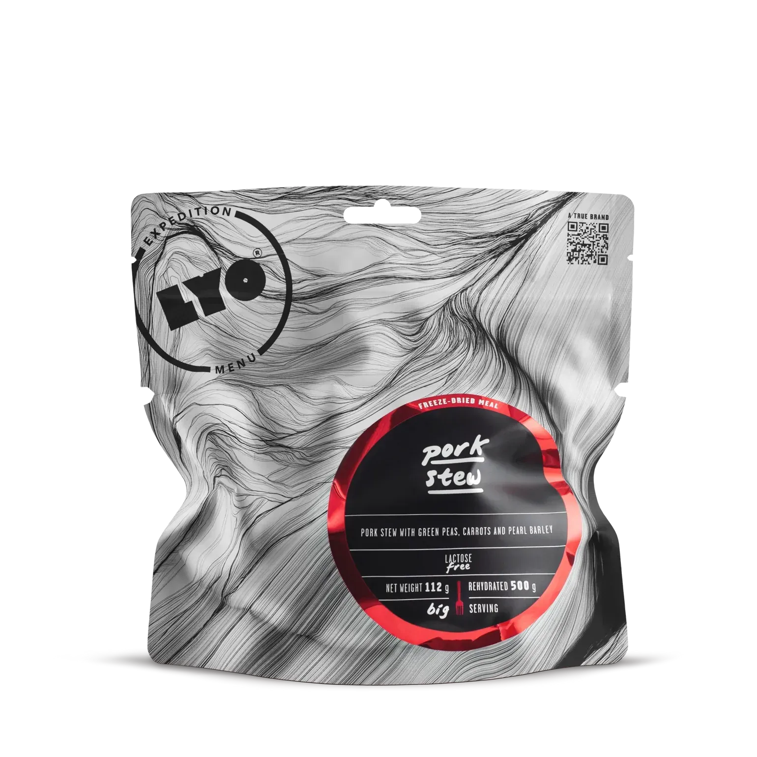 LYOFOOD Pork Stew är en smakrik fläskgryta med potatis, bönor och grönsaker i en rik tomatbaserad sås. Tillverkad med 100 % naturliga ingredienser och helt utan laktos eller konstgjorda tillsatser. Rätten ger en kraftig och näringsrik middag – perfekt efter en lång dag på berget, jakt eller expedition. Låg vikt, hög energi och god smak – klar på några minuter.Specifikationer