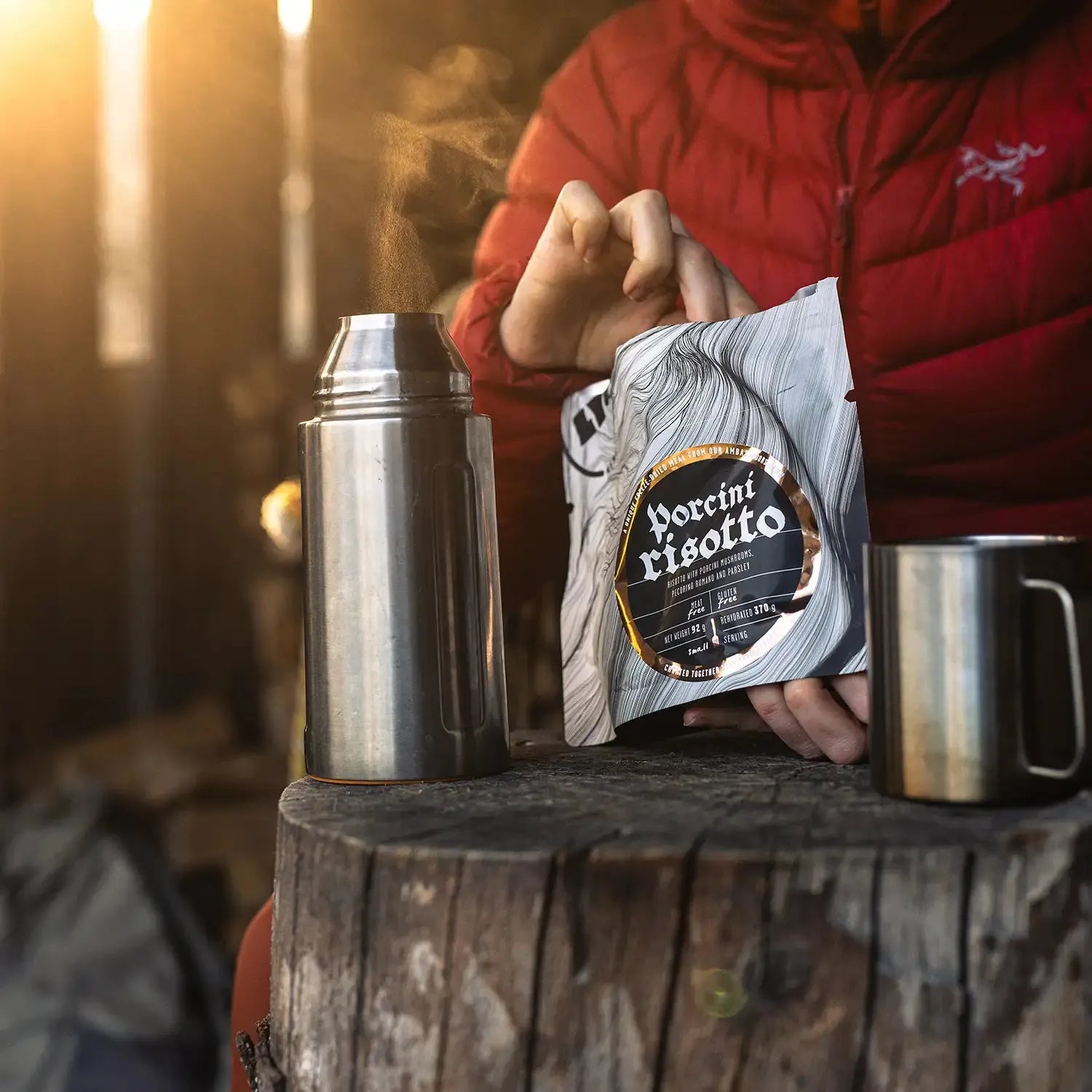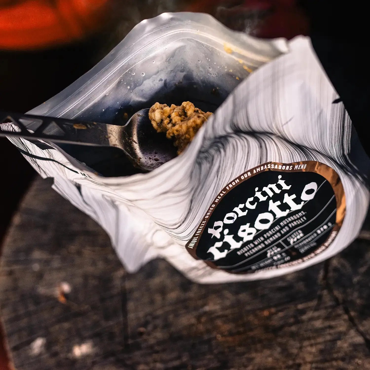 LYOFOOD Porcini Risotto är en krämig turmåltid med ris och karljohansvamp, även känd som porcini. Den innehåller smör, grädde, lök och vitlök, och är smaksatt med örter och en skvätt vitt vin för att framhäva den naturliga smaken av svamp. Rätten är gjord med 100 % naturliga ingredienser – inga konstgjorda tillsatser – och är perfekt för vandring, camping eller som en varm middag på kalla kvällar i fält.