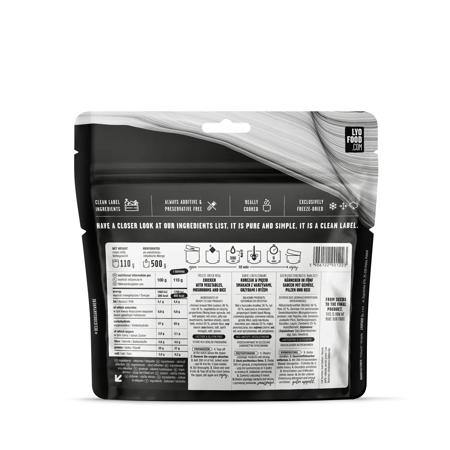LYOFOOD Kycklinggryta med ris ger dig en balanserad och näringsrik middag gjord på möra kycklingbitar, ris och grönsaker. Rätten är gjord med 100 % naturliga ingredienser, fri från konserveringsmedel och laktos, och är frysetorkad för låg vikt och lång hållbarhet. Perfekt för vandring, jakt och expeditioner där energi och enkel tillagning är viktigt.