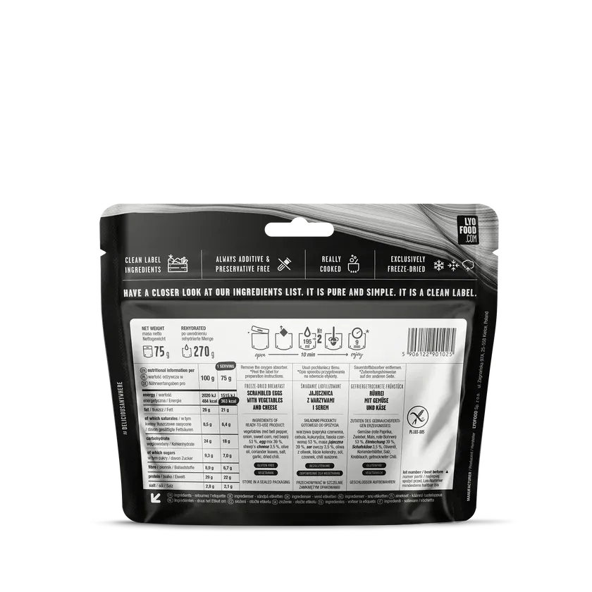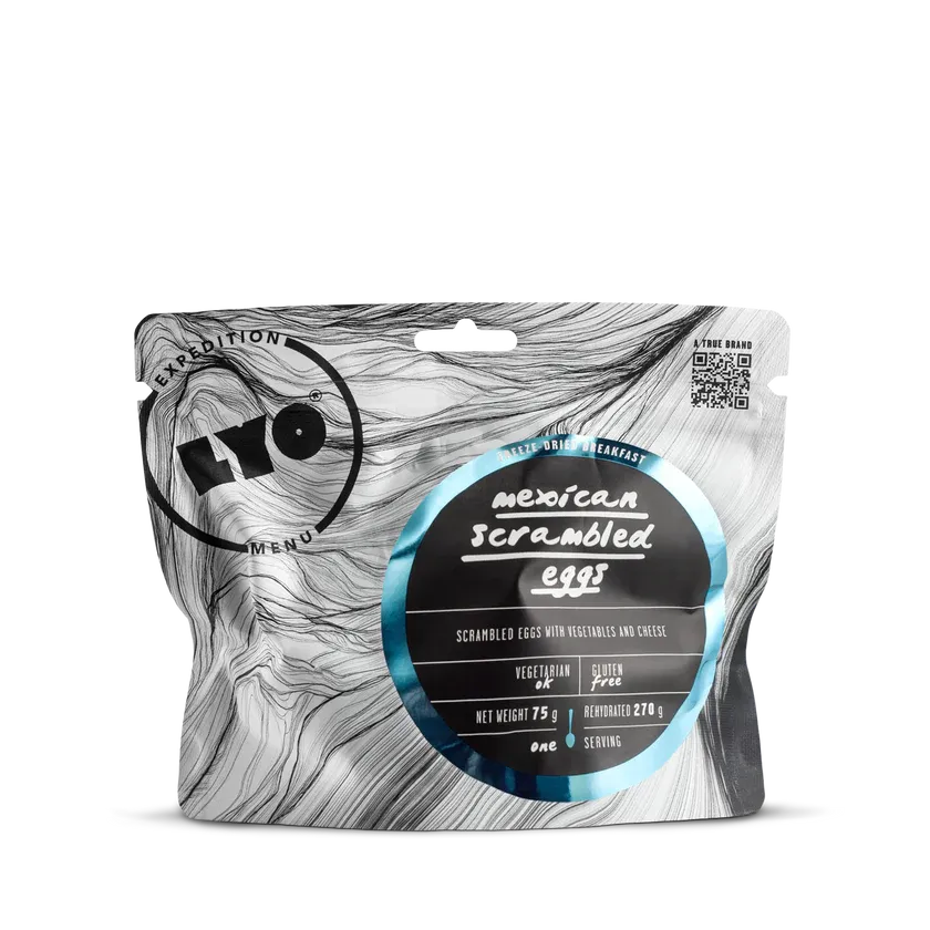 LYOFOOD Mexican Scrambled Eggs är en varm och mättande frukost med kryddiga grönsaker, äggblandning och ost. Inspirerad av mexikanska smaker och gjord med 100 % naturliga ingredienser. Rätten är fri från konserveringsmedel och konstgjorda tillsatser, och passar perfekt för bergsvandringar, expeditioner och camping – när du behöver en god och snabb start på dagen.Specifikationer