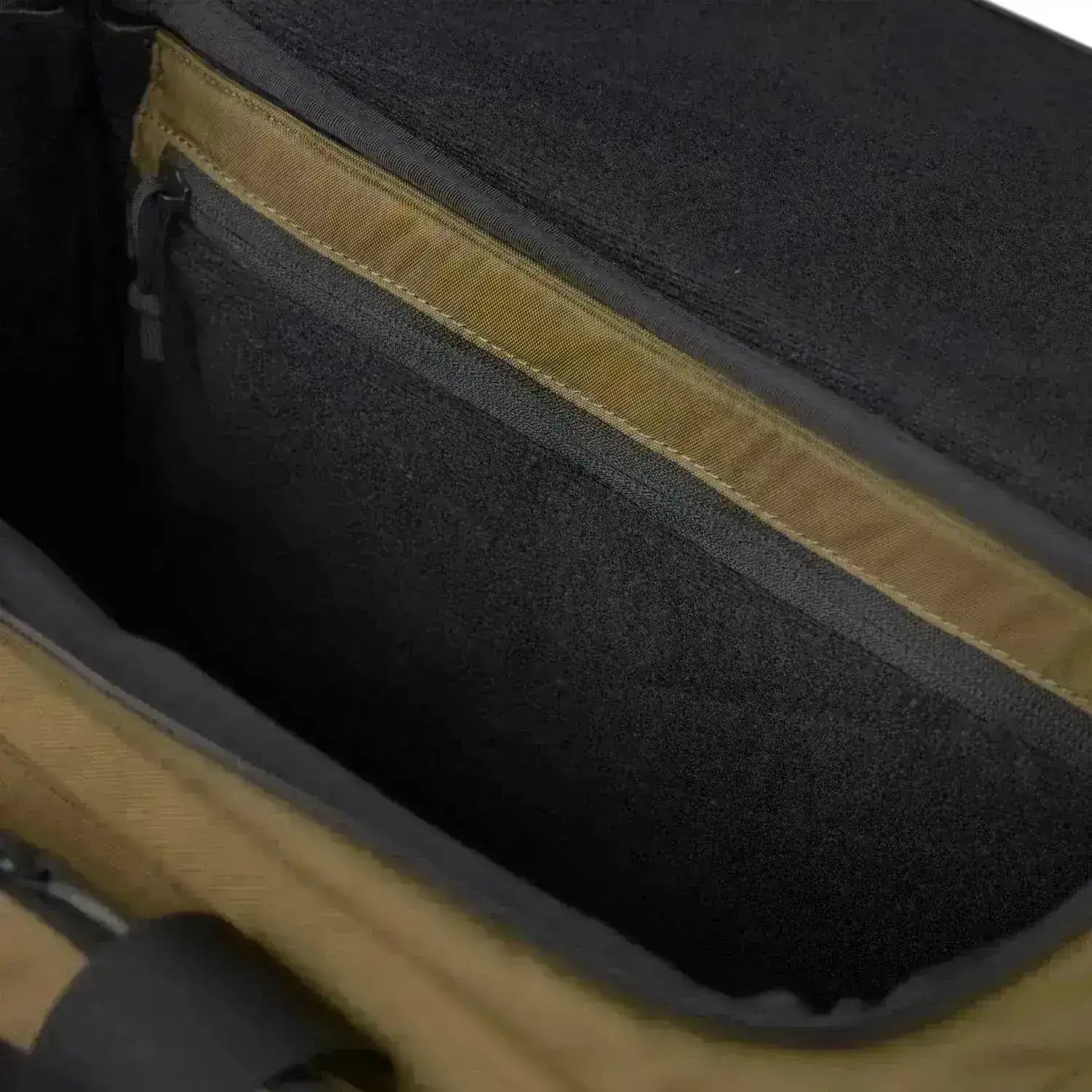 På vänster sida finns det en andra, kvadratisk cargoficka fodrad med mjuk kardborre, också med dragkedja. Höger sida har två öppna fickor med dragsko. På baksidan av väskan finns det en platt kardborreficka. Den sista externa fickan är på väskans klaff och kan rymma småsaker som nycklar. Insidan av väskan är fodrad med mjuk kardborre, vilket gör den helt kompatibel med insatserna från vår VIS-serie.