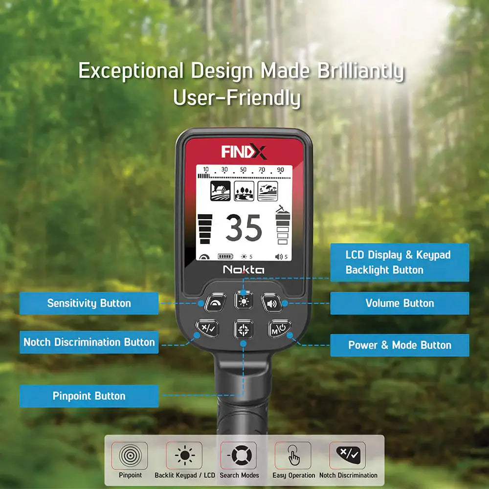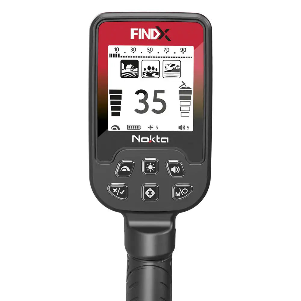 Nokta FINDX er en komplett metalldetektor designet for enkel bruk og høy ytelse. Den kombinerer intuitive menyer med avanserte funksjoner som pinpointing, dybdeindikator og notch-diskriminering. Den 11” store søkespolen er vanntett (IP68) og gir høy følsomhet – perfekt for søk i jord, sand og grunt vann.