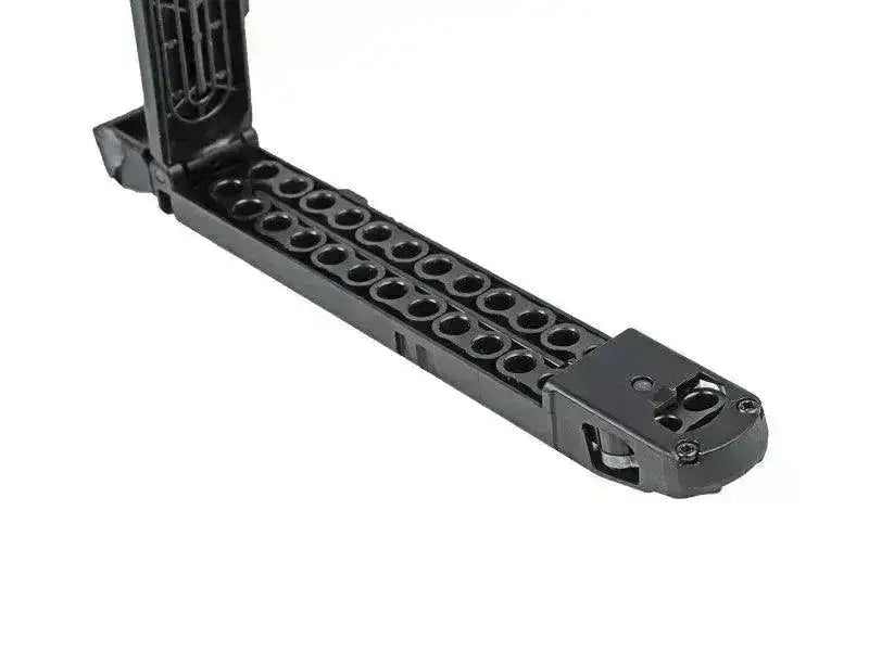 Byggd med en solid metallrutschbana och en polymerram och med hela 30(!!!) patroner i magasinet är detta den första pistolen i sitt slag. MagasinDen är bältesmatad och pistolen är semi-auto kapabel att avfyra både 4,5 mm pellets och BBs så fort du kan trycka på avtryckaren! Med realistisk blowback, och driven av en 12 grams CO2-patron som hålls i greppet, kan du avfyra din ammunition upp till 430fps!!! (beroende på ammunitionsvikt/sammansättning). Med så många skott i tidningen är denna pistol perfekt för timmar av skoj!