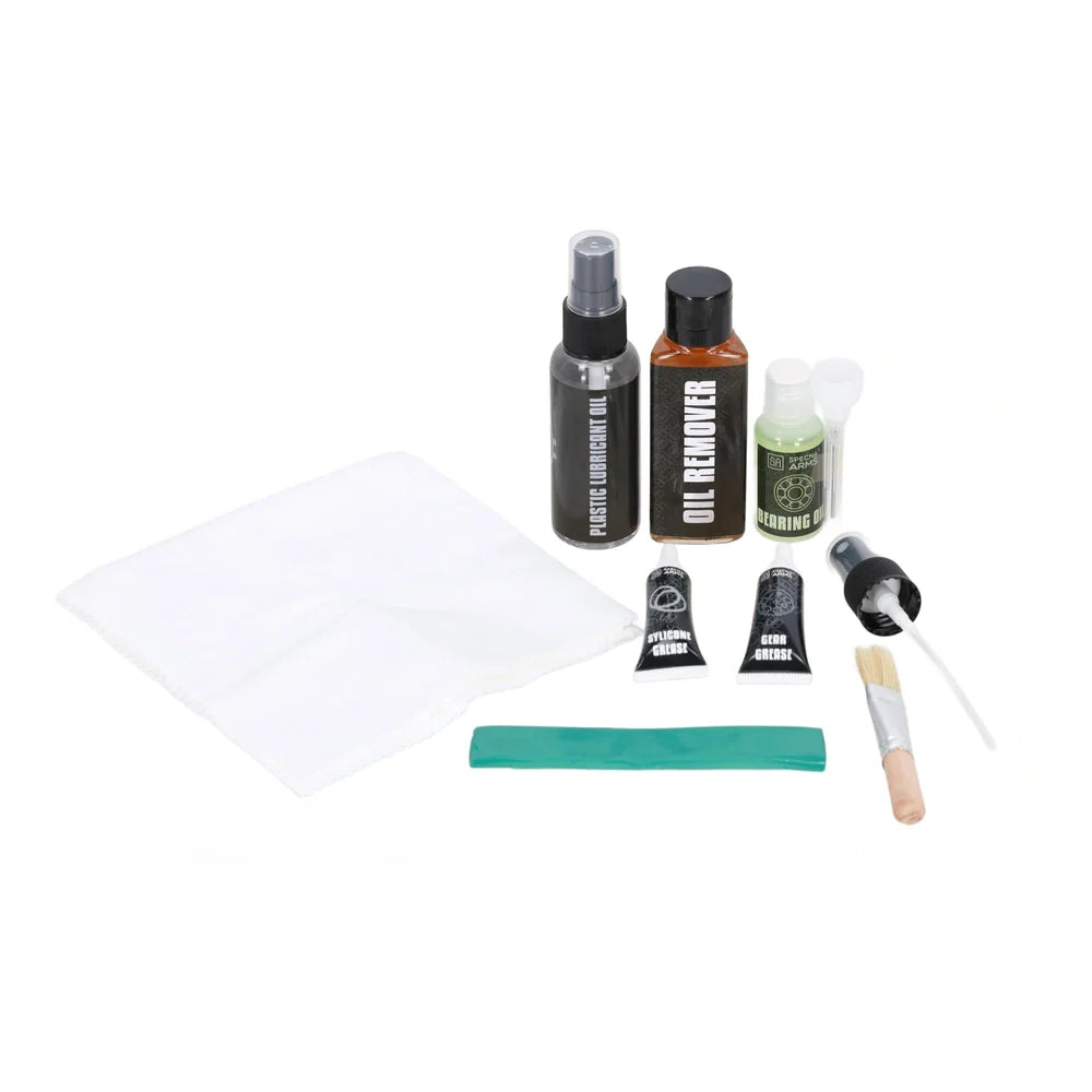 Settet inneholder flere typer smøremidler og rengjøringsutstyr utviklet for ulike deler av en AEG, fra O-ringer og pakninger til gir, lager og plastkomponenter.