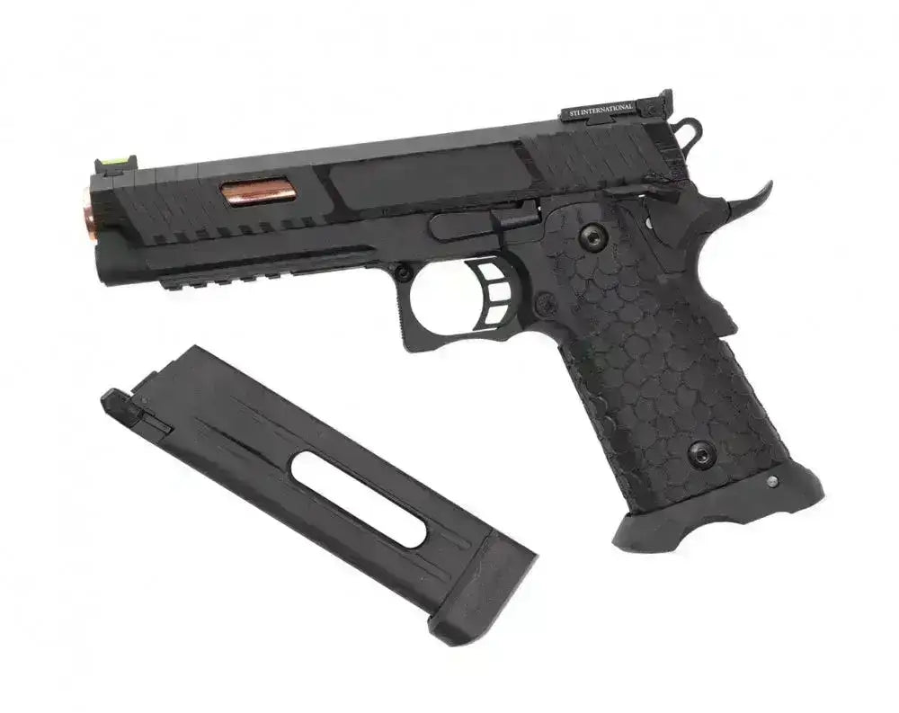 Denna licensierade STI Combat Master 2011 pistol är det moderna resultatet av det klassisk design från 1911. Designen uppskattas av dem som är involverade i tävlingsskytte för alla tekniska egenskaper som ger både precision och snabbhet. Remsorna på sliden är CNC-skurna för att minska vikten och samtidigt ge ett perfekt lastgrepp. Förlängd