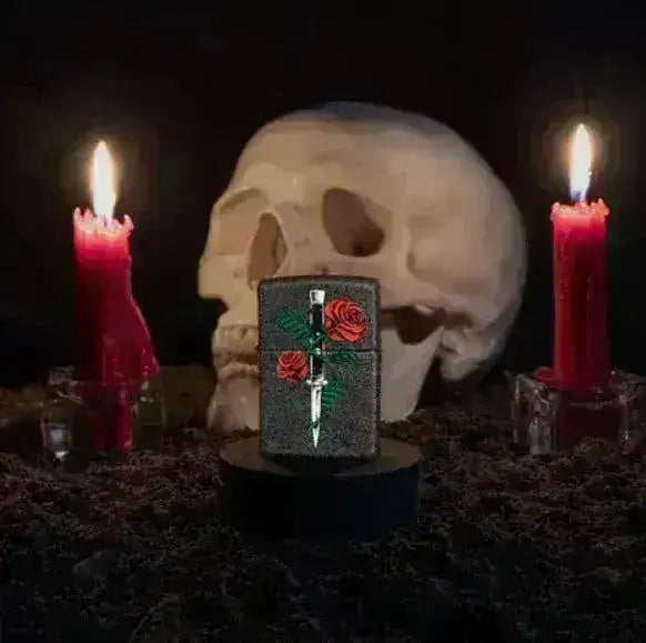 En riktig klassiker med stilettkniv och rosor i tatueringsstil. Black Crackle® finish ger en matt och sträv yta, detta är en snygg effekt som också gör att du inte ser fingeravtryck.